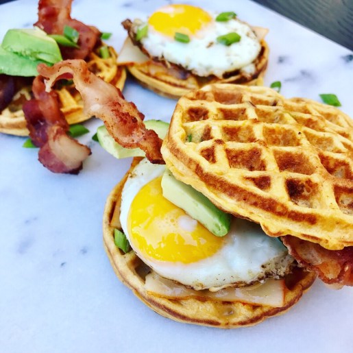 2. When waffles are all cooked, assemble one side with cheese and egg. Bacon and avocado on the other side. Top with some green onions and you’re done!